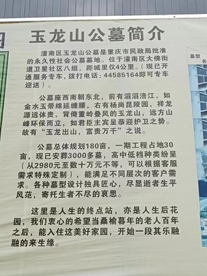 天蠶重慶軟件開發公司小編語:潼南區玉龍山公墓故有“玉龍出山,富貴萬千”之說。公墓總體規劃180畝,能滿足不同層次的客戶需求。各種墓型設計獨居匠心,盡顯逝者生平風范,寄托生者不盡的哀思。這里是人生的終點站,亦是人生后花園,公墓管理系統小編:衷心希望桑榆暮年的老人百年之后能入住這里,在這個美好家園開始一段新的來生緣。